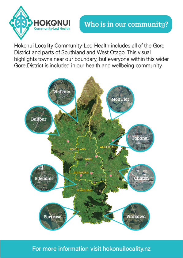 Hokonui Community-Led Health includes all of the Gore District and parts of Southland and West Otago. This visual highlights towns near our boundary, but everyone within this wider Gore District is included in our health and wellbeing community.